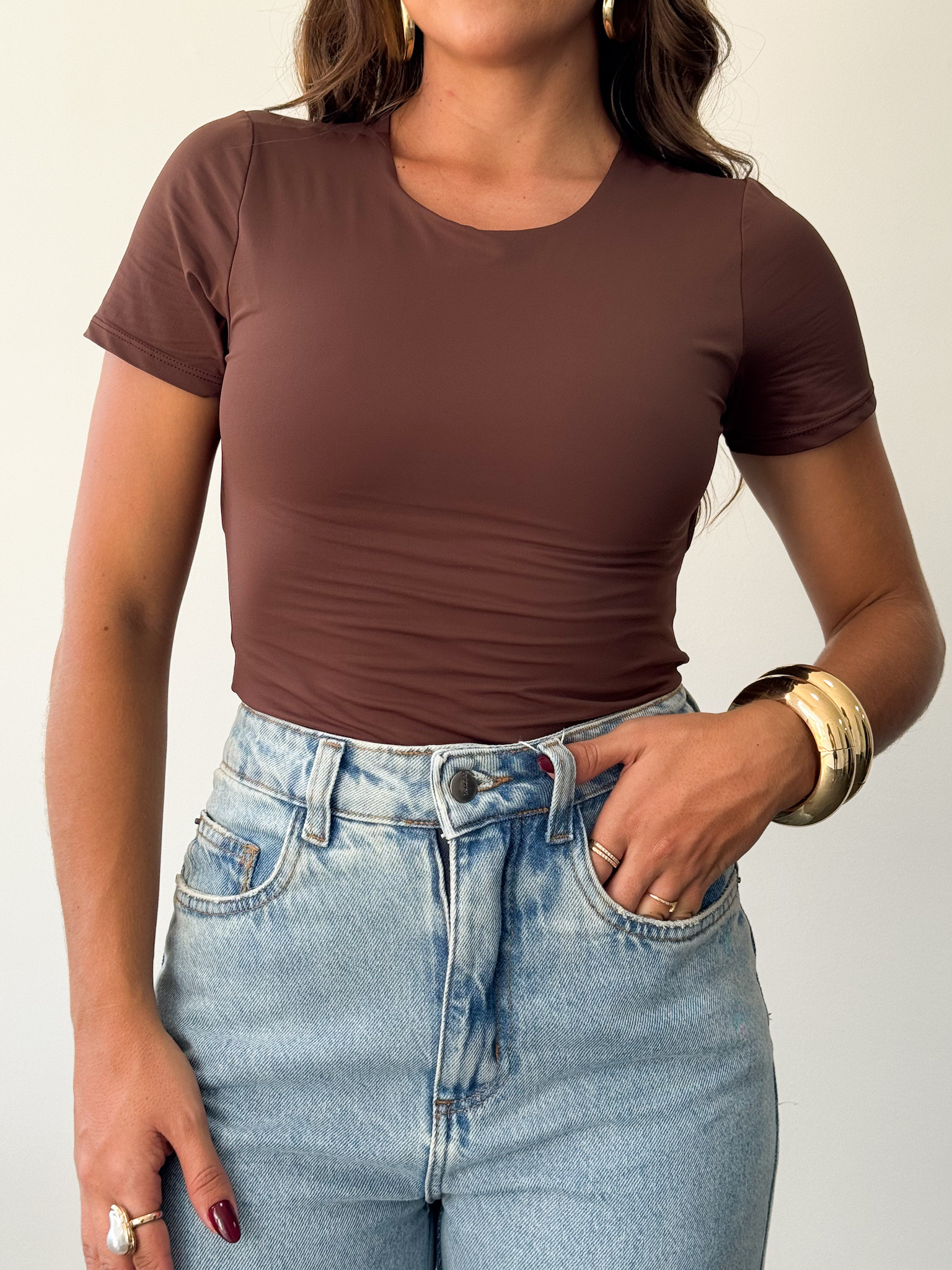Baby tee com modelagem ajustada e detalhe de nó nas costas, trazendo um toque moderno e estiloso ao look. Versátil, confortável e cheia de charme.