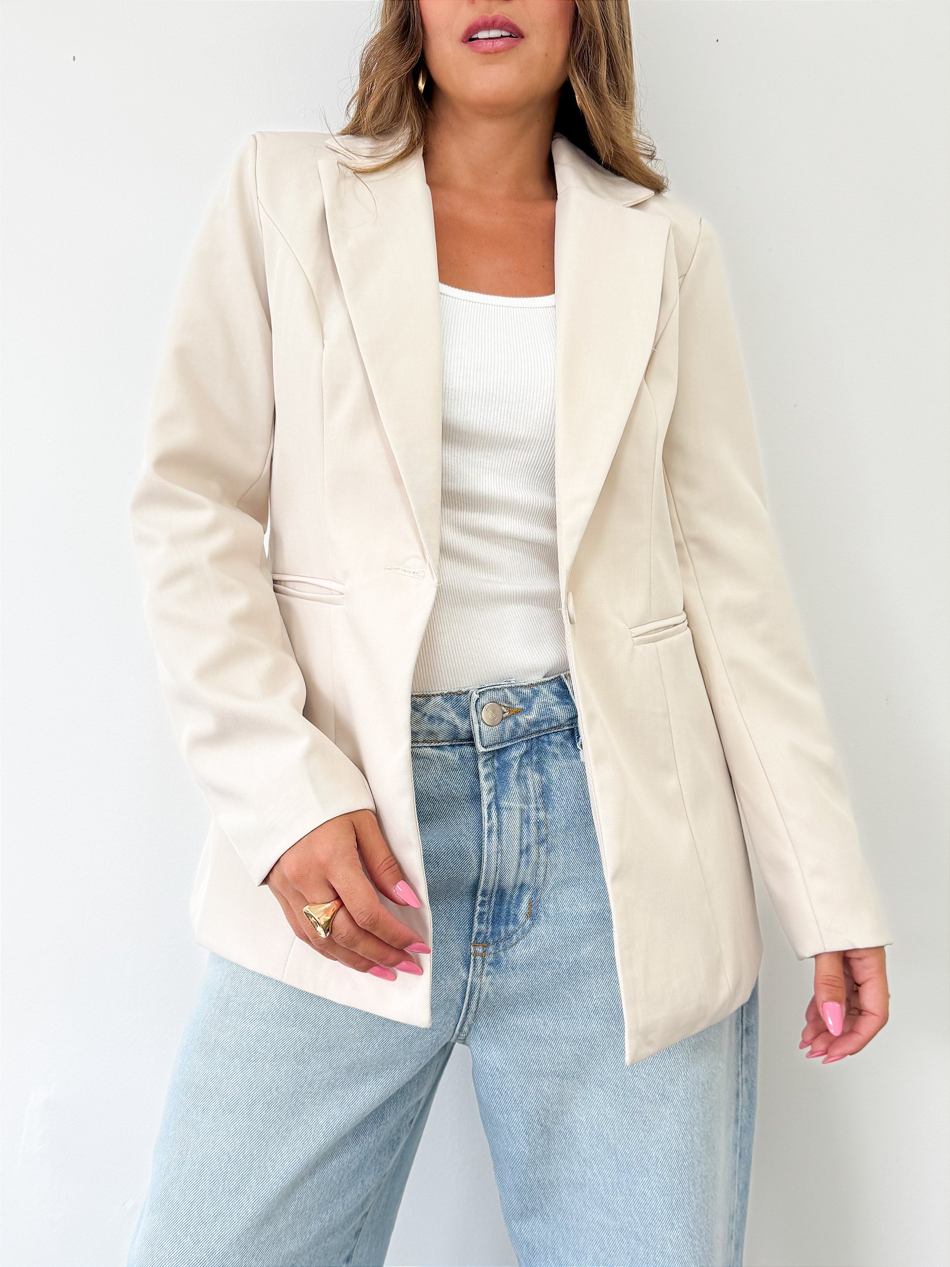 blazer estruturado que transforma qualquer look em produção. modelagem impecável, caimento elegante e aquele toque sofisticado que deixa até o básico com cara de fashion week. versátil, atemporal e poderoso — perfeito pra usar aberto mais despojado ou fechado marcando a silhueta. peça-chave que eleva tudo, do jeans ao vestido.