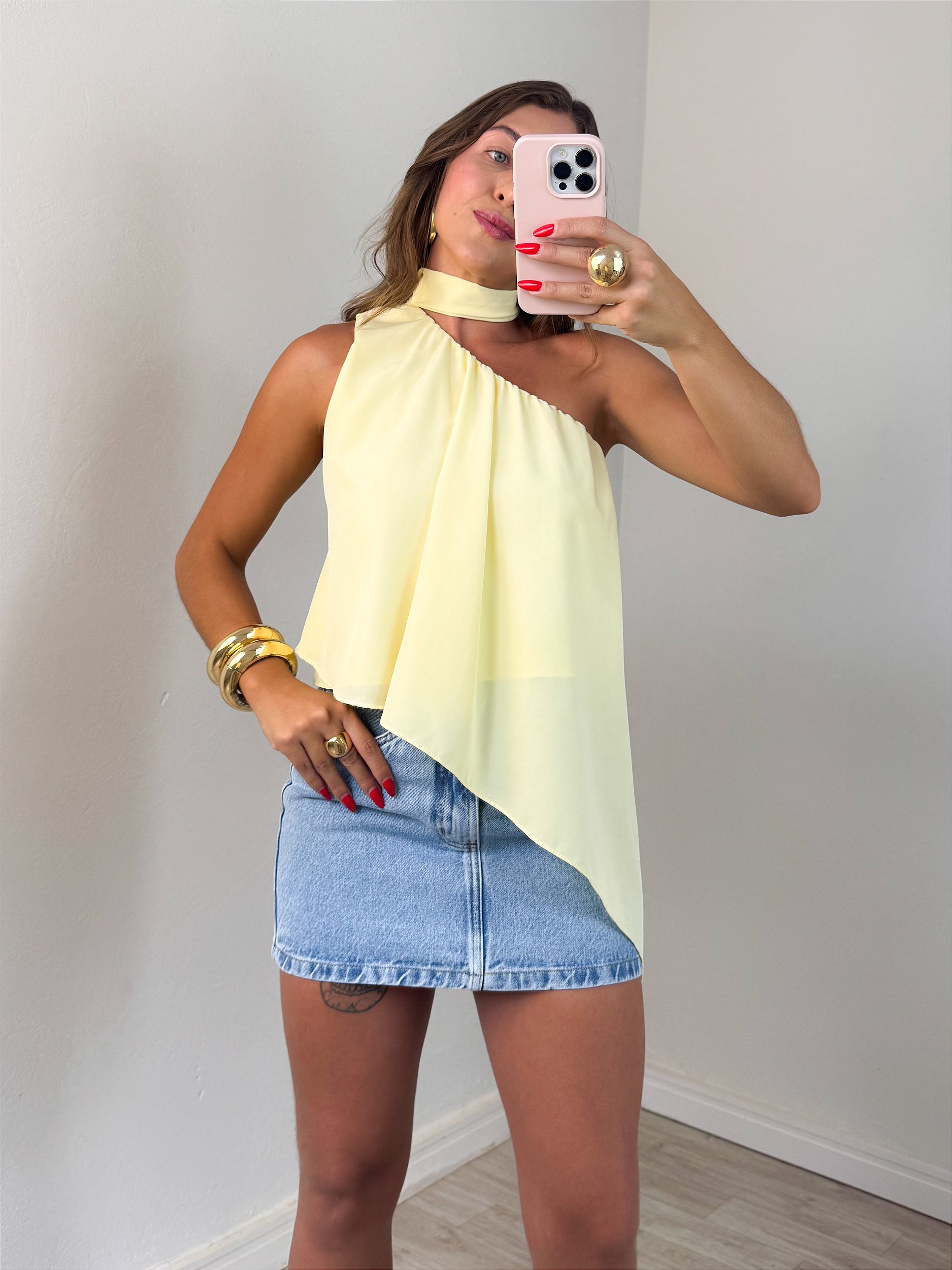 Blusa frente única sem mangas, com caimento fluido e amarração no pescoço, que une leveza e sofisticação. O movimento suave do tecido cria um visual elegante e feminino, enquanto o design valoriza o colo e os ombros com naturalidade. Perfeita para composições versáteis, do casual chic ao look mais refinado.