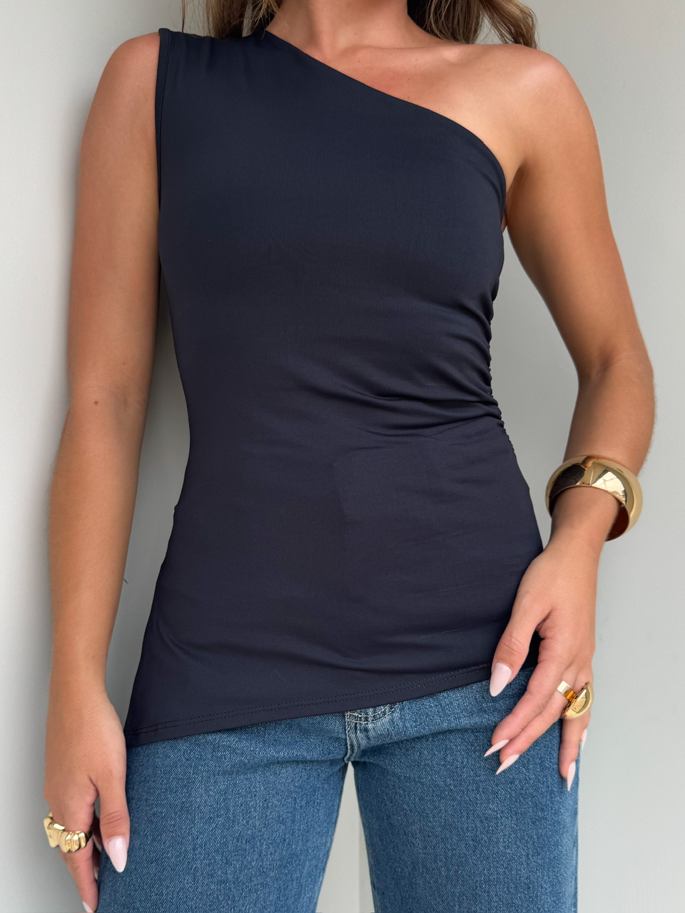 Blusa nula manga com gola e drapeado luxuoso, em poliamida de caimento perfeito. Moderna e elegante, é aquela peça que transforma qualquer look em algo chic e cool sem esforço.