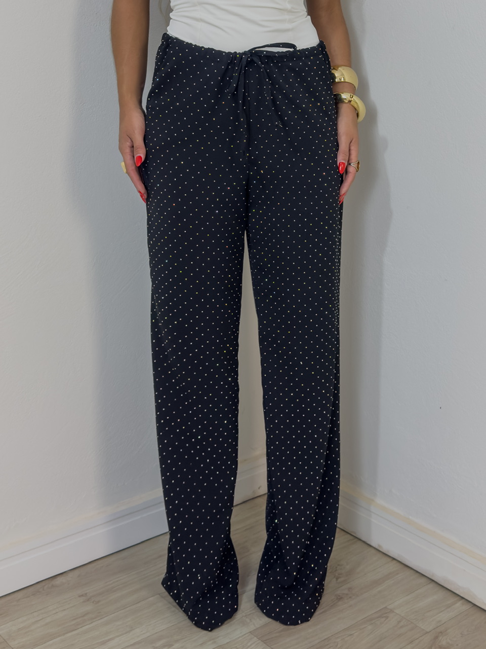 Calça preta soltinha estilo pantalona com aplicação de strass, que une conforto e brilho na medida certa. Peça statement para transformar qualquer look básico em algo sofisticado e cheio de personalidade. Possui forro.