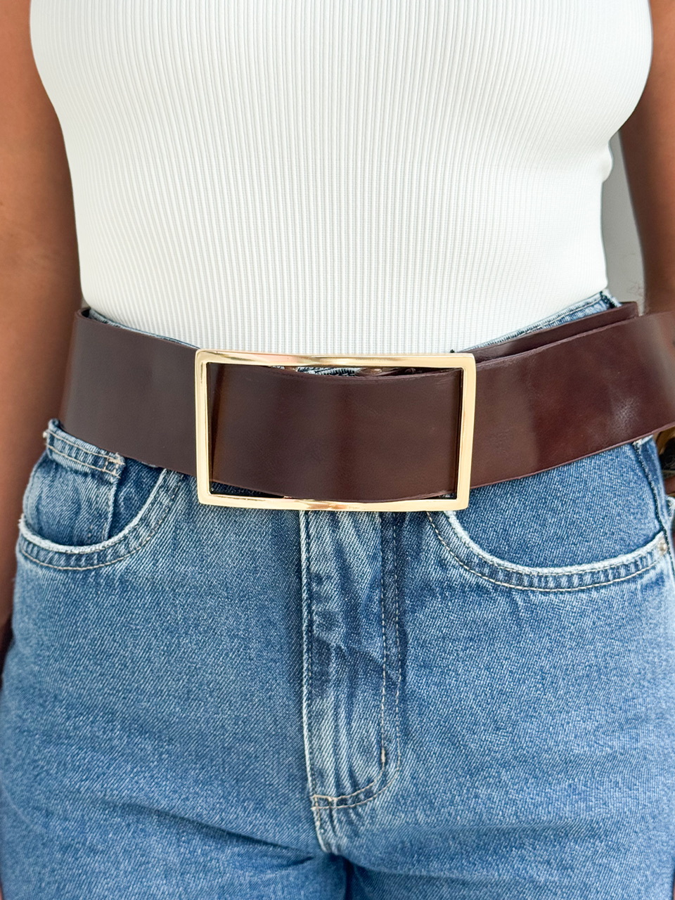 Cinto marrom mais grosso, em couro sintético, com fivela quadrada dourada e delicada. Um mix de impacto e sofisticação que valoriza a cintura com estilo marcante.