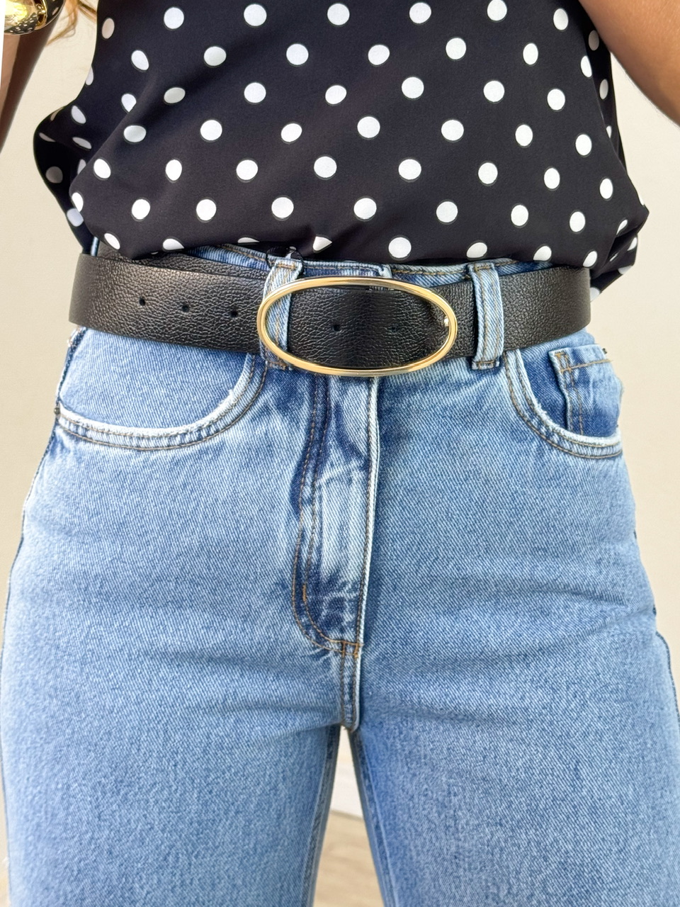Cinto preto em couro sintético, com fivela oval dourada brilhante que traz charme sutil. Um acessório elegante e versátil para arrematar seus looks com estilo.