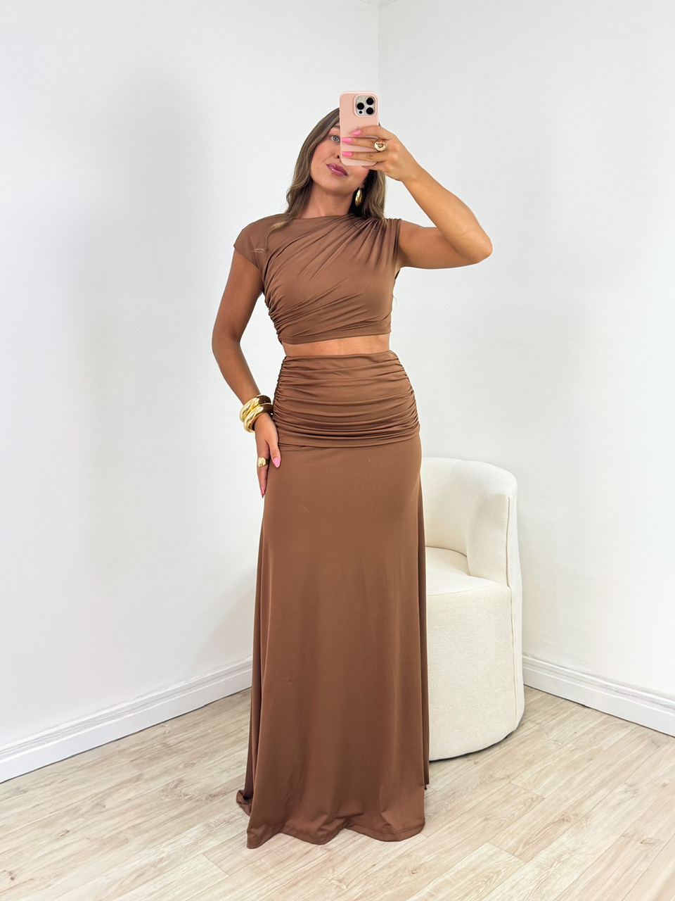 conjunto de top e saia simplesmente lindo, daqueles que vestem e já entregam o look pronto. o top valoriza na medida certa e a saia traz equilíbrio com um caimento impecável. juntos, criam uma produção harmônica, feminina e super atual — perfeita pra eventos, festas ou aquele momento que pede um look marcante sem esforço. elegante, versátil e apaixonante.