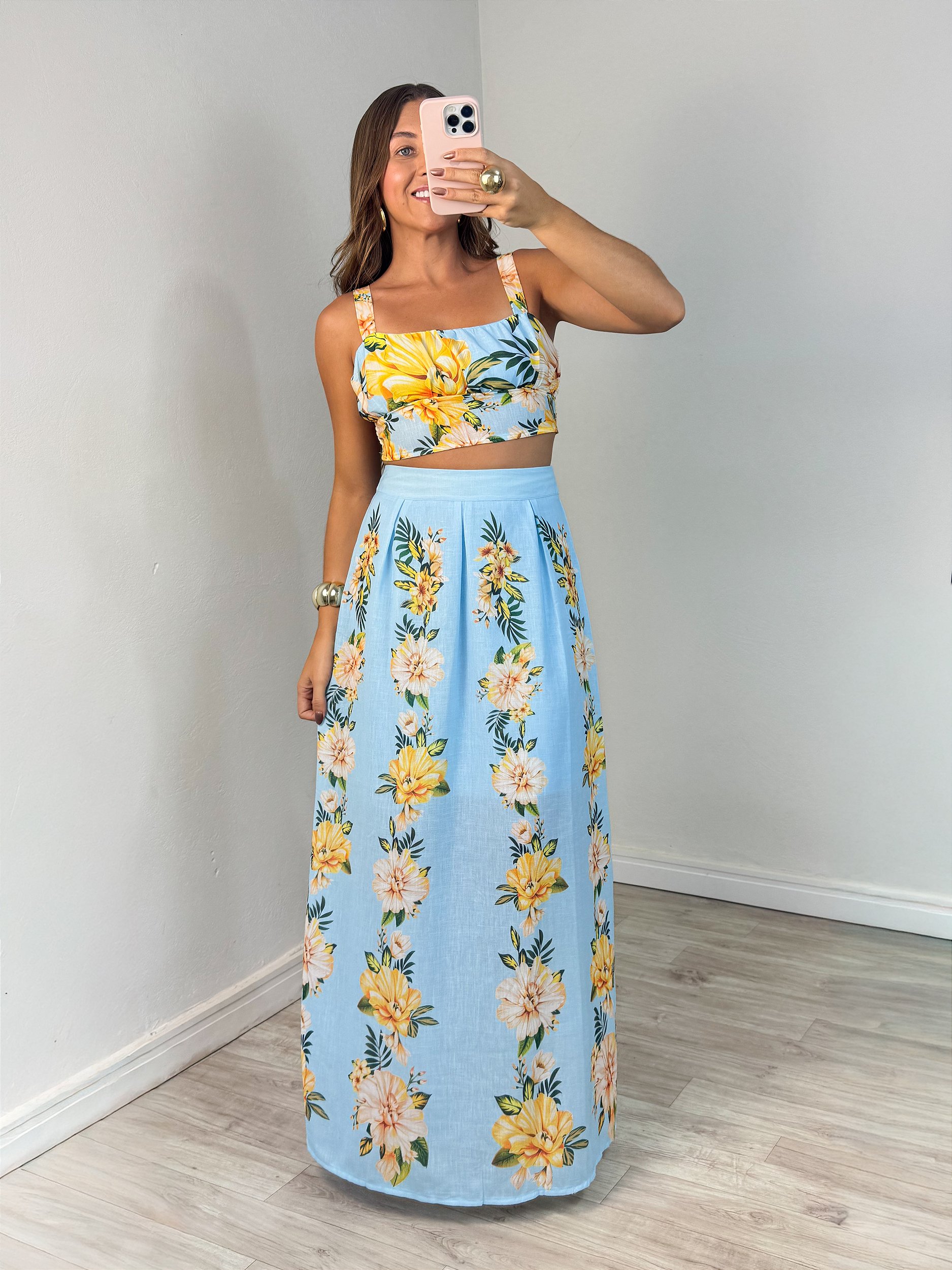 Romântico e encantador, traduz delicadeza e feminilidade em cada detalhe. As flores trazem leveza e charme ao visual, enquanto a saia midi garante um caimento elegante e atemporal. Perfeito para ocasiões especiais ou produções leves do dia a dia, é aquele conjunto lindo que ilumina o look com suavidade e estilo