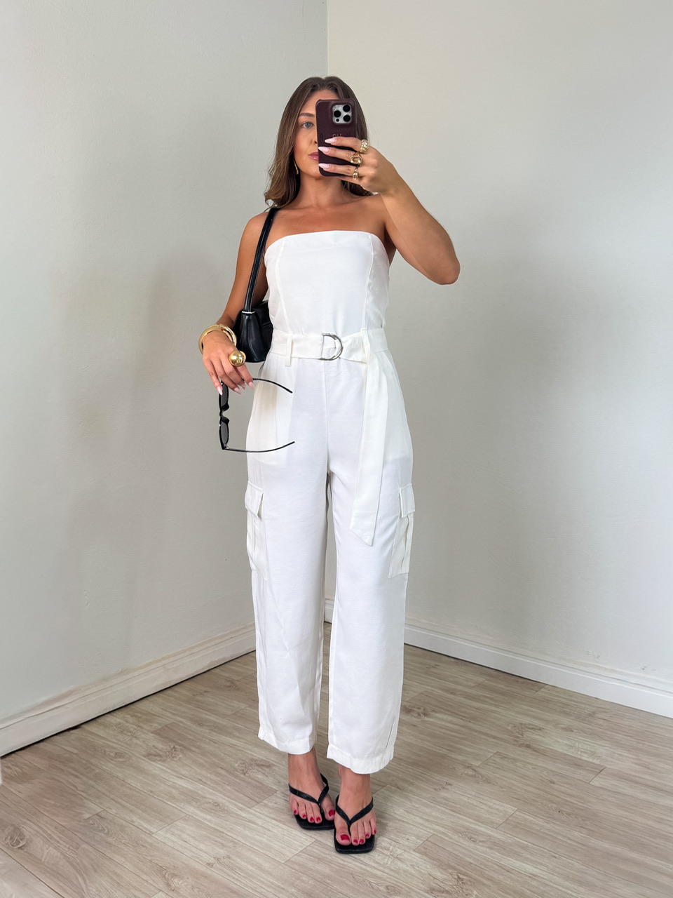 Macacão tomara que caia em tecido tipo linho, com caimento leve e toque sofisticado. Acompanha cinto e bolsos discretos estilo cargo, unindo elegância e modernidade em um só look. Possui bolsos laterais, elástico e zíper para maior segurança & acompanha o cinto.