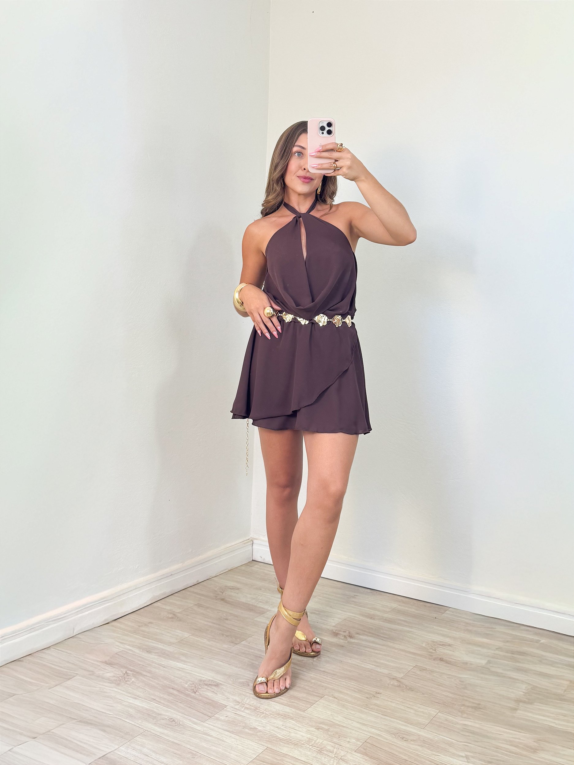Macaquinho Cris: curto e fluido, com decote degagê, costas abertas, amarração versátil, forro e elástico na cintura. Leve, prático e perfeito para dias quentes ou ocasiões especiais.