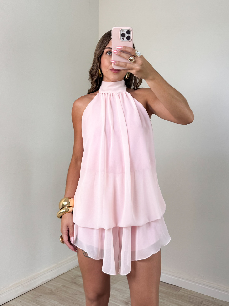 possui forro. possui elástico na cintura. possui amarração no pescoço.