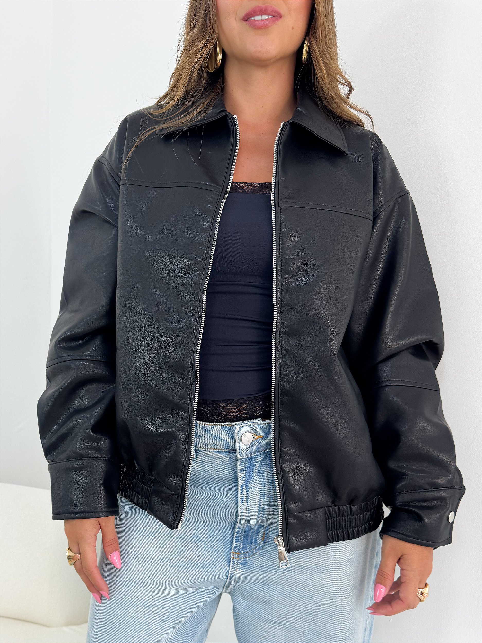 jaqueta em pu que entrega atitude instantânea ao look. modelagem estruturada, acabamento impecável e aquele efeito couro que transforma até a produção mais básica em algo poderoso. versátil e atemporal, combina com jeans, vestido ou alfaiataria — perfeita pra criar contraste e deixar tudo mais fashionista. peça-chave pra um closet cheio de personalidade.