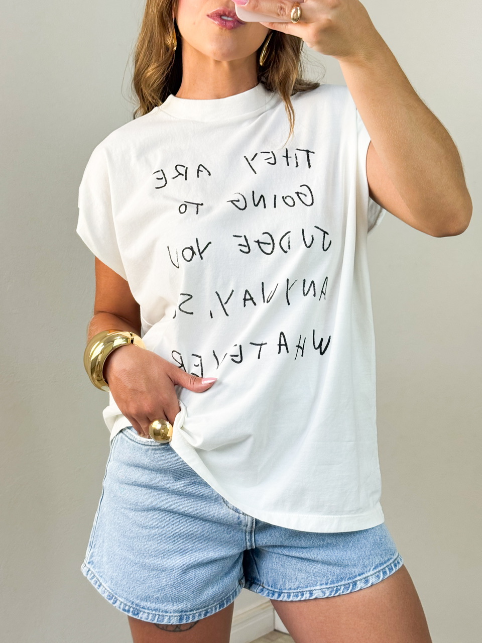 Regata t-shirt off white com escrita em fonte fina preta que traduz um estilo minimalista e contemporâneo. Perfeita para compor looks casuais com um toque sofisticado. Fica mais soltinha no corpo.