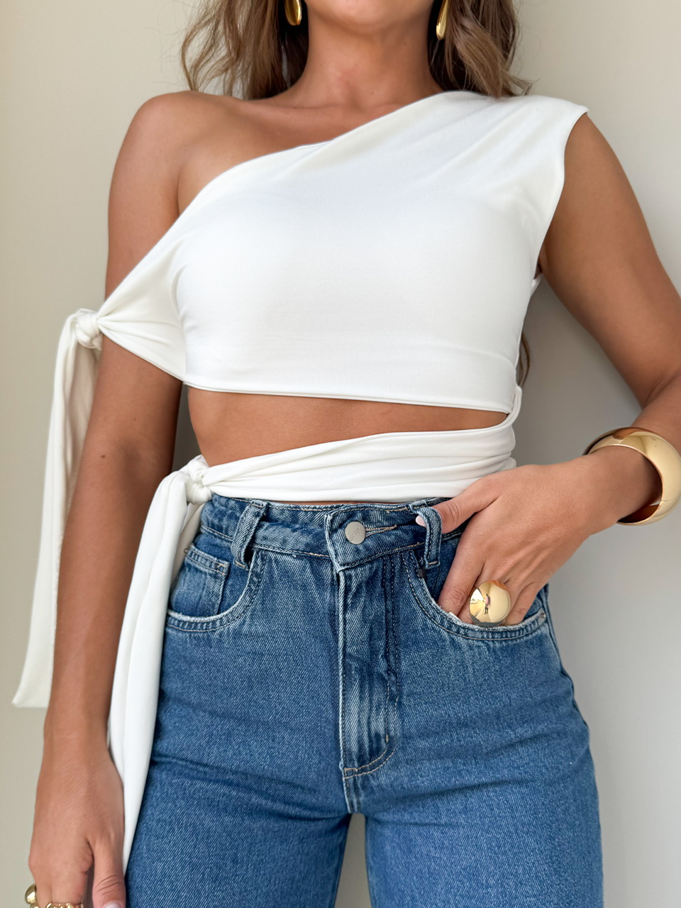 Top de um ombro só, com amarração lateral. Fashionista e sofisticado, garante looks modernos e cheios de estilo para as amantes da autenticidade.