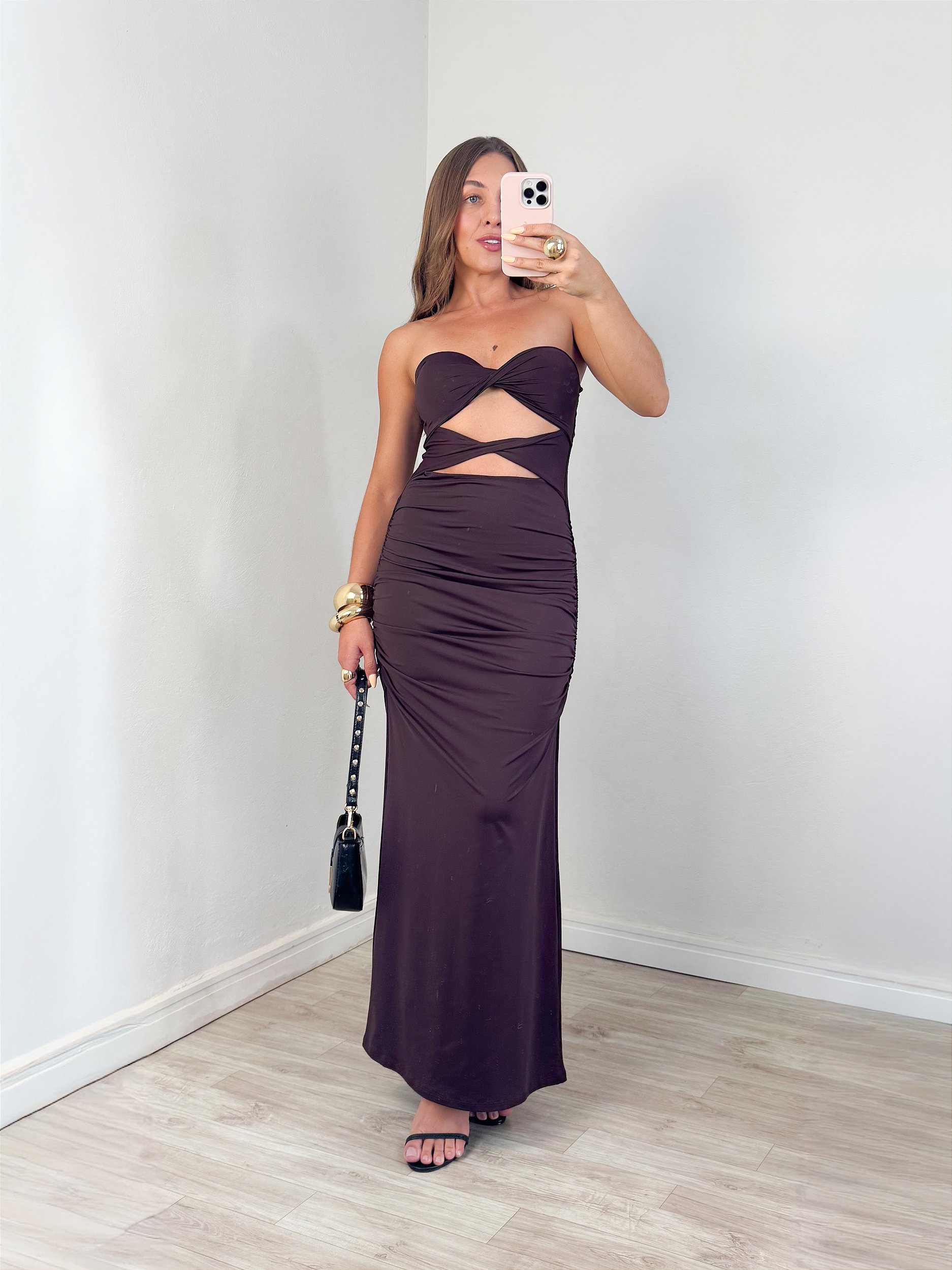 Vestido midi de poliamida tomara que caia com recortes abaixo do busto que realçam a silhueta com ousadia e elegância. O caimento ajustado e o tecido encorpado criam um visual sofisticado, moderno e irresistivelmente marcante.