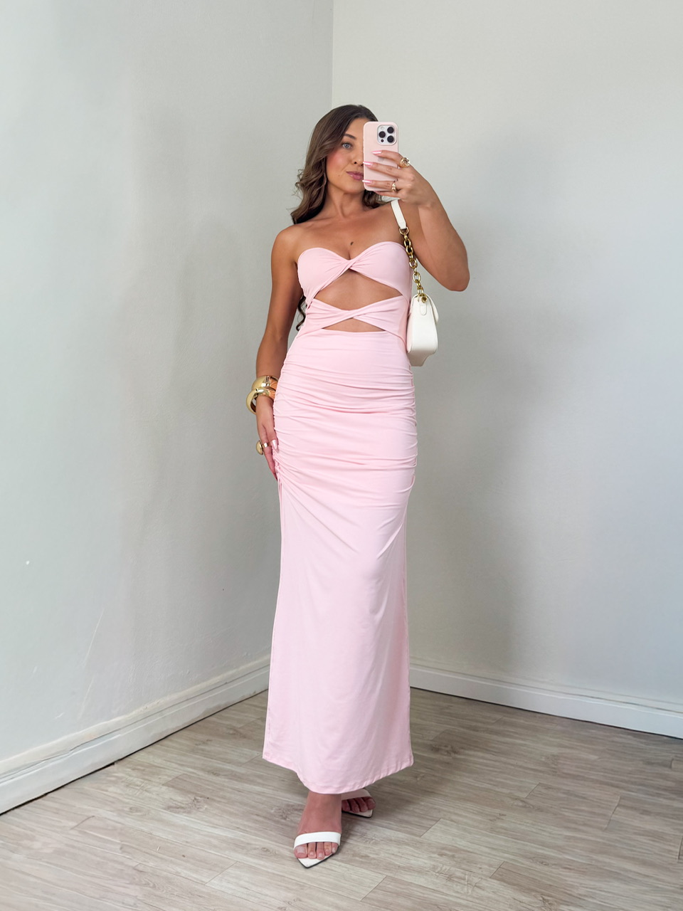 Vestido midi de poliamida tomara que caia com recortes abaixo do busto que realçam a silhueta com ousadia e elegância. O caimento ajustado e o tecido encorpado criam um visual sofisticado, moderno e irresistivelmente marcante.