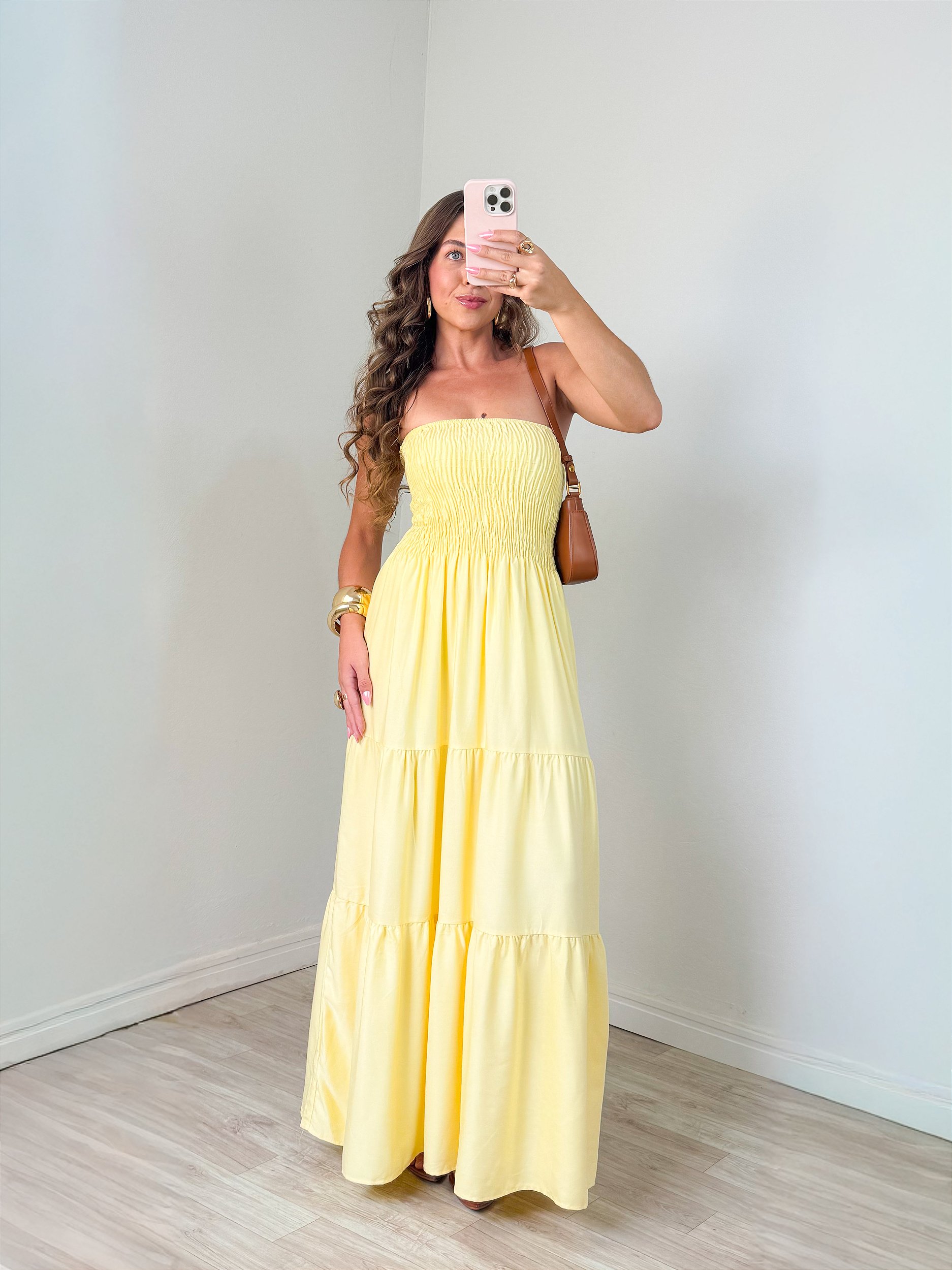 Vestido longo tomara que caia que traduz leveza e feminilidade. O busto com lastex valoriza o corpo com conforto, enquanto a saia fluida em camadas traz movimento e um toque romântico. Peça perfeita para um visual fresco, elegante e despretensiosamente chic. Possui lástéx que estica!
