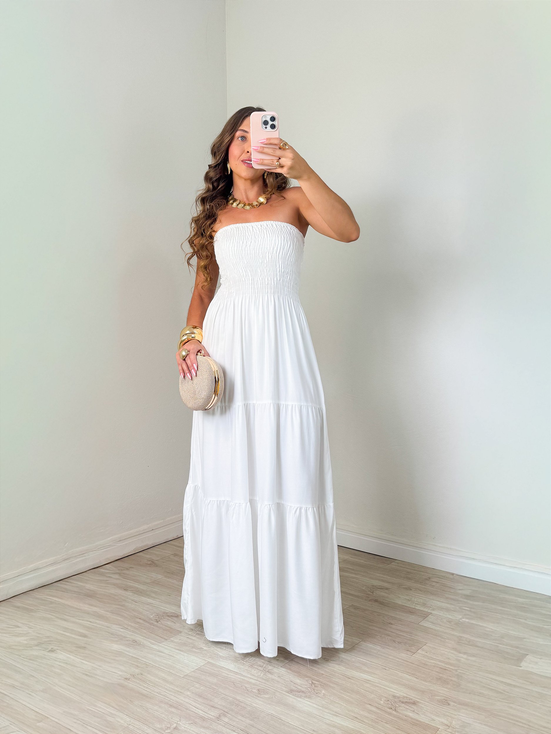 Vestido longo tomara que caia que traduz leveza e feminilidade. O busto com lastex valoriza o corpo com conforto, enquanto a saia fluida em camadas traz movimento e um toque romântico. Peça perfeita para um visual fresco, elegante e despretensiosamente chic. Possui lástéx que estica!